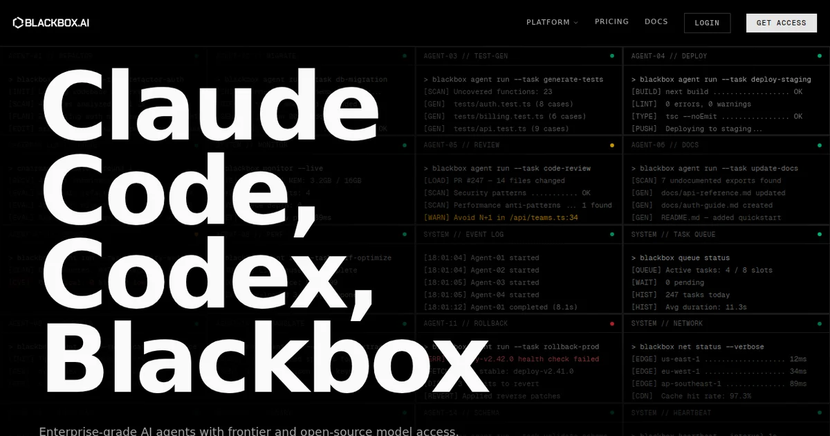 Founded as a code-focused AI tool, Blackbox has expanded into a multi-surface platform available on web, desktop apps, mobile, IDE extensions (VS Code, JetBrains), CLI, and API. The pitch is simple: stop juggling AI subscriptions and use one platform that lets you switch models depending on the task.